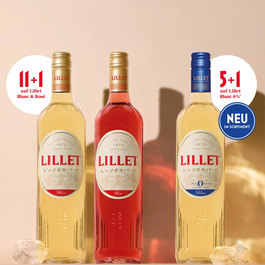11plus1-Aktion für Lillet Blanc und Lillet Rosé: Mit der Bestellung von 11 Flaschen kommt eine Flasche gratis dazu.